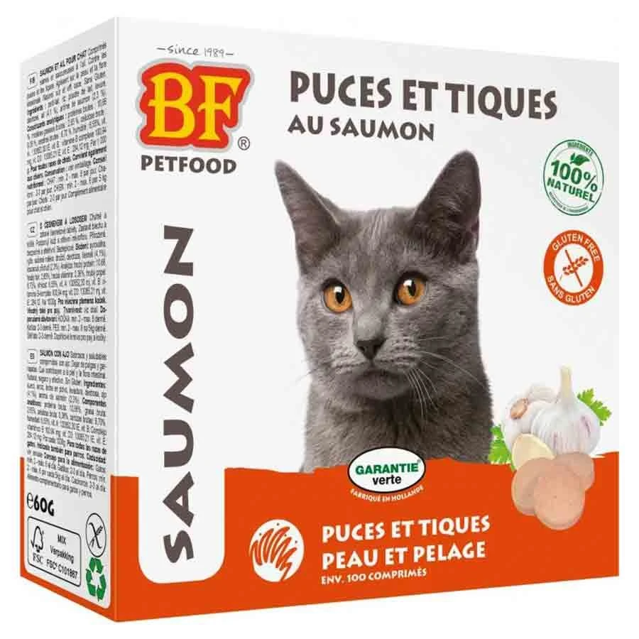 Les comprimés anti puces et tiques au saumon de chez Biofood sont à base de petit-lait, de riz et de levure de biÚre pour un effet antiparasitaire.